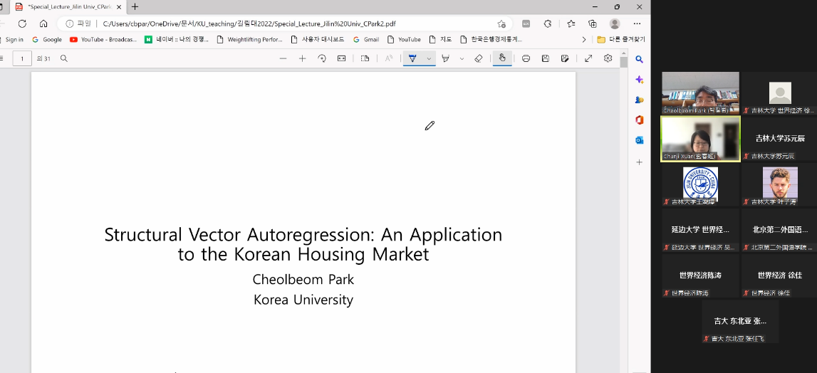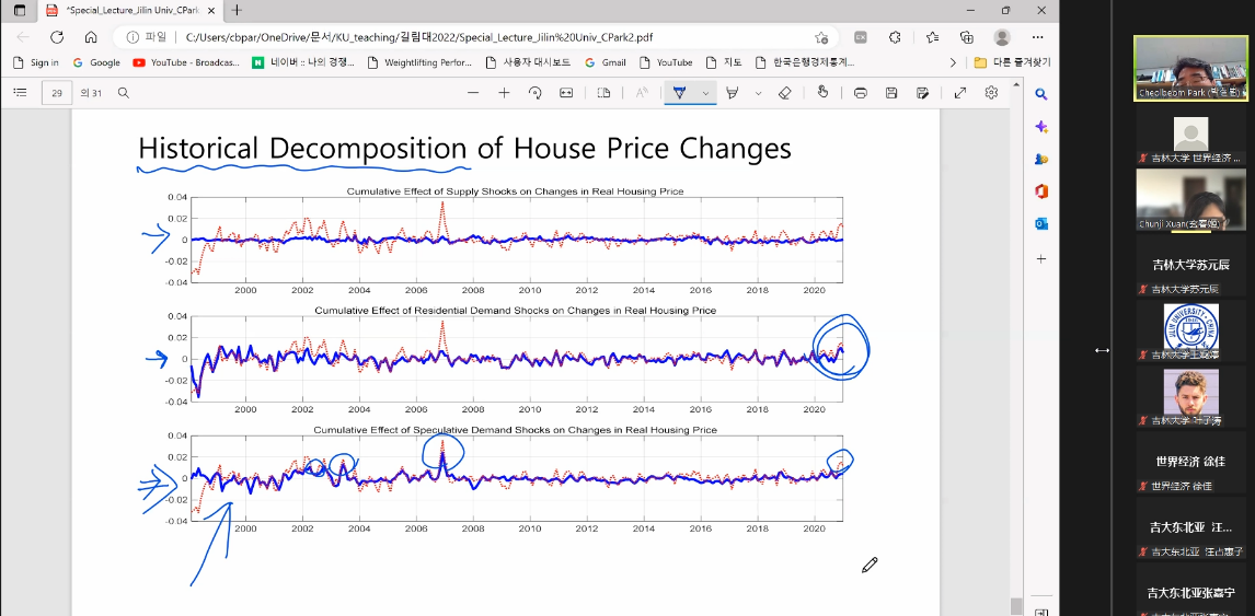 In the first part of the lecture, Prof. Park introduced in detail the structural vector autoregression (SVAR) model, the SVAR model under short-term restrictions, the SVAR model under long-term restrictions, the SVAR model under sign restrictions, and the SVAR model under shock-based restrictions. In the second part of the lecture, Prof. Park introduced the Korean power tax system and its impact on the Korean real estate market. In the third part of the lecture, Professor Park introduced the process of empirical research and analysis of the Korean real estate market using the SVAR model. Finally, Professor Park explained the recent development of the Korean real estate market in terms of supply shocks, real demand and speculative demand based on the results of the study.