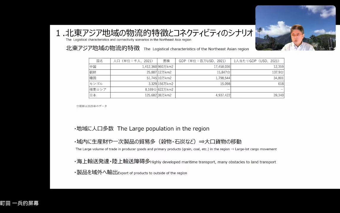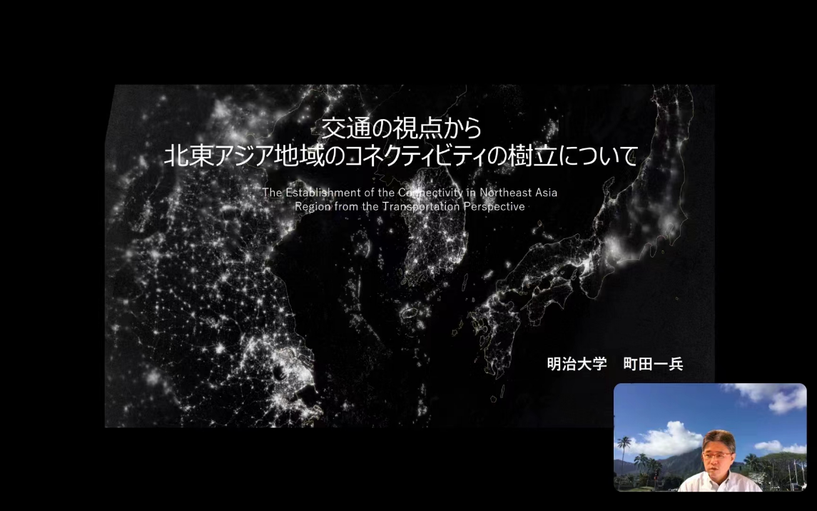 Prof. MACHIDA IPPEI examined the establishment of connectivity in Northeast Asia from the perspective of transportation. The lecture is divided into six parts: the first part was about the characteristics of logistics in Northeast Asia; the second part discussed the possibility of building a logistics hub on the Korean Peninsula; the third part analyzed the position of the Far East of Russia and Mongolia in the logistics of Northeast Asia; the fourth part introduced the role of Japan in the logistics of Northeast Asia; the fifth part evaluated the possibility of the opening of the Arctic route; the sixth part discussed the role of Northeast China in the logistics of Northeast Asia.