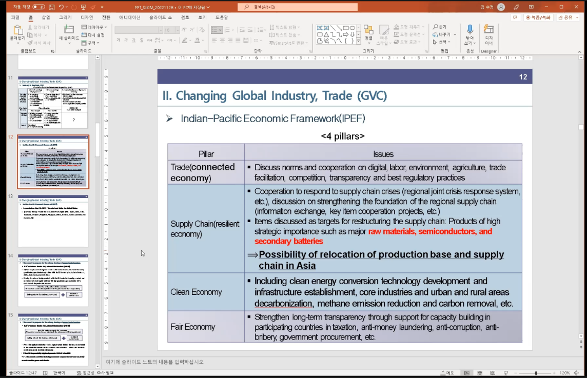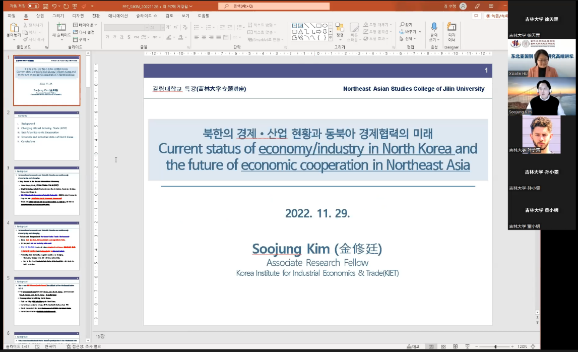 In the first part of the lecture, Dr. Kim introduced the development process of the status of China, Japan and South Korea in global value chains, analyzed the preconditions and possible effects of North Korea's entry into global value chains (GVCs), and the prospects and difficulties of regional cooperation in East Asia. In the second part of the lecture, Dr. Kim introduced the history of industrial development of China, Japan and Korea in GVCs, expectations of future GVC transformation, and the impact of climate and environmental issues on global trade and supply chains. In the third part of the lecture, Dr. Kim introduced the current status of economic cooperation in East Asia. In the fourth part of the lecture, Dr. Kim introduced the current situation of North Korea's economic operation and industry, the impact of the international environment on North Korea's economic development, and the prospects and requirements for North Korea to join the global value chain. Finally, Dr. Kim gave an outlook on the prospects of industrial cooperation in East Asia and the problems that may arise, and then explained the impact of the DPRK's (Democratic People's Republic of Korea) participation in GVCs on the future development of the East Asian region.
