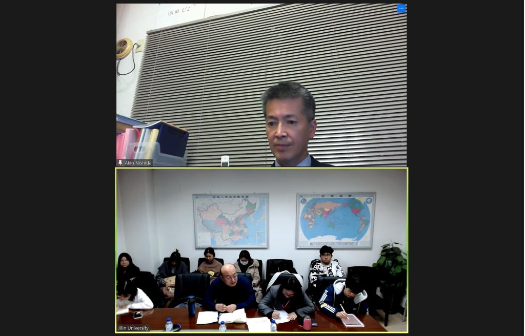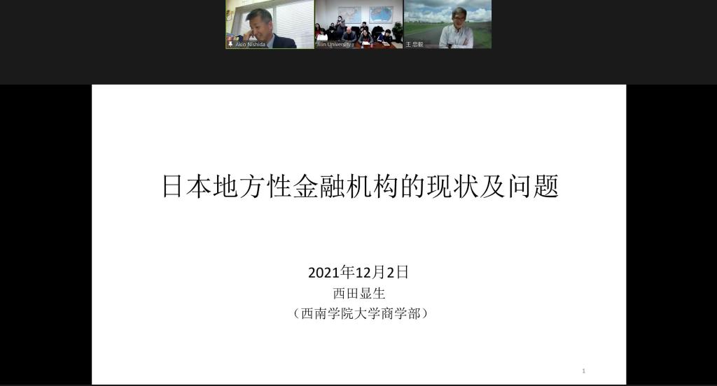 On December 2nd, 2021, Professor NISHIDA AKIO, Dean of the Faculty of Commerce of Seinan Gakuin University, Japan, delivered a lecture on "Current Situation and Problems of Local Financial Institutions in Japan" at the invitation of the Northeast Asian Research Center of Jilin University, the Northeast Asian Studies College of Jilin University, the Institute of Northeast Asian Studies, and the Institute of Japanese Studies of Jilin University. The lecture was held both as an online lecture and in person. Professor Cui Jian, Vice President of the Northeast Asian Studies College of Jilin University, presided over the lecture and addressed the audience, while Associate Professor Li Hongmei, Deputy Director of the Institute of World Economics, Northeast Asian Studies College of Jilin University, acted as the on-site interpreter. The lecture was attended by some faculty members, postgraduate students and Ph.D. students from the Northeast Asian Studies College of Jilin University.