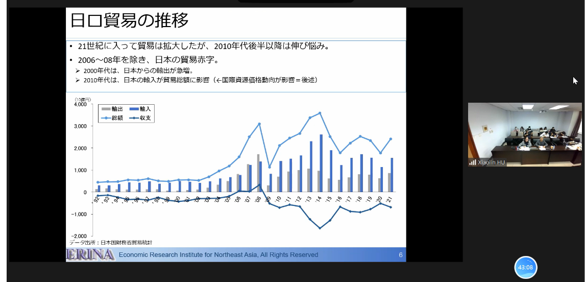 On November 10th, 2022, a high-end lecture on "30 Years of History of Japan-Russia Economic Relations" of the High-End Symposium on Northeast Asia International and Regional Studies was successfully held at Jilin University. The lecture was jointly organized by the Northeast Asian Research Center of Jilin University, the Northeast Asian Studies College of Jilin University, and the Special Committee for Northeast Asian Regional Studies, Academic Association for International Cultural Exchange. The Northeast Asian Studies College of Jilin University invited Professor ARAI HIROFUMI, Director and Chief Research Fellow of the Research and Studies Department, Economic Research Institute for Northeast Asia (ERINA), to deliver the lecture. The lecture was hosted by Associate Professor Li Hongmei, Deputy Director of the Institute of World Economics, Northeast Asian Studies College of Jilin University. Associate Professor Hu Renxia, Northeast Asian Studies College of Jilin University, and postgraduate students and doctoral students majoring in World Economics and International Politics attended and enlivened the lecture. At the beginning of the lecture, Associate Professor Li Hongmei, on behalf of Prof. Wu Hao, Dean of the Northeast Asian Studies College of Jilin University, extended a warm welcome and high appreciation to Prof. ARAI HIROFUMI.