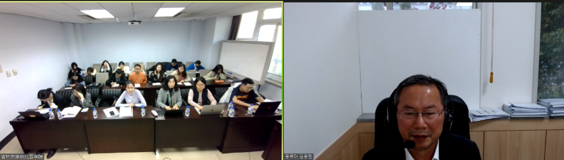 On November 4th, 2021, Professor Kim Young-hyun of the North Korean Studies of Dongguk University in South Korea gave an online academic report with the theme of The Situation on the Korean Peninsula and The Peace Process at the invitation of the Northeast Asian Research Center and Northeast Asian Studies College of Jilin University. The academic report was chaired by Professor Zhang Huizhi, Deputy Director of the Northeast Asian Research Center and Director of the Institute of Korean Peninsular Studies, with Professor Jin Xiangdan as the interpreter, and the research team on the Korean Peninsula and graduate students from related majors participated in the event online or offline.
