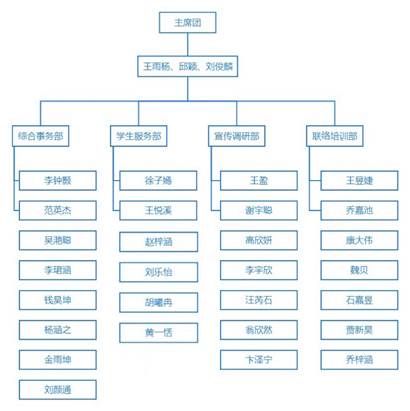 学生会分为联络培训部、宣传调研部、学生服务部和综合事务部四个部门。