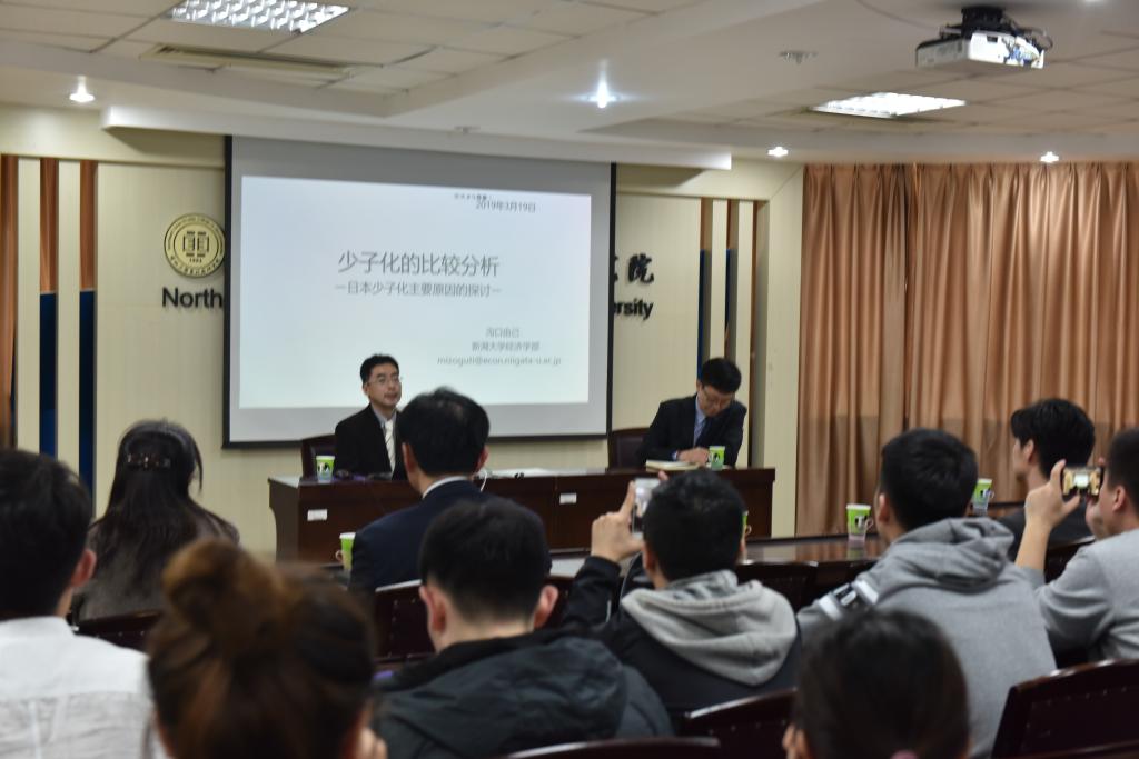 3月19日下午,新潟大学经济学部沟口由己副教授和法学部稻吉晃副教授分别以“少子化的比较分析”、“港口城市新潟——期待对岸贸易的历史”为题做了学术报告。沟口教授在报告中,结合具体数据对二战后,尤其20世纪70年代以来的少子化现象进行了分析,从生育的直接成本和间接成本解释了出现少子化现象的原因,提出导致日本少子化问题不断加剧的主要原因在于影响育龄妇女实现生育与工作并立的雇佣制度,并就此对比分析了中国的少子化问题。稻吉晃副教授在报告中回顾了新潟作为一个港口城市的发展历程,分析了新潟在不同历史阶段的发展思路,指出随着日本经济发展模式的转变和经济重心的转移,新潟作为日本海一侧港口城市的区域优势不断减少,自主发展能力下降,最终走上了依赖于中央政府的发展道路。东北亚研究院的部分教师和研究生共50余人聆听报告,并就报告内容积极提出问题与报告人交流讨论,现场气氛特烈。
