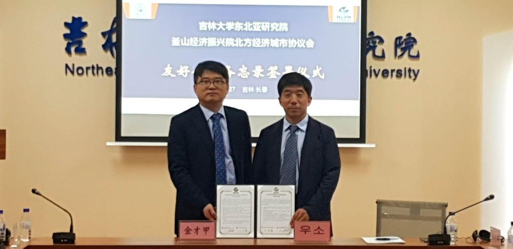 会议就东北亚地区物流旅游合作、中韩朝等国的经济合作方案、东北亚城市经济发展等议题进行广泛深入的交流和讨论, 会议取得了丰硕的成果。会后,韩国釜山经济振兴院北方经济城市协议会金才甲局长和东北亚研究院于潇院长作为双方合作单位代表签署了友好合作备忘录,双方表示将以此次研讨会为契机,推动双方进一步开展交流合作,建立高校、政府和企业间新的合作模式