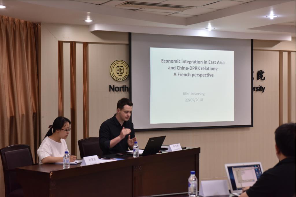 2018年5月22日上午,法国里昂高等师范学院东亚学院研究员兼博士研究生Théo Clément先生访问东北亚研究院,做学术报告并与东北亚研究院部分师生进行了座谈。座谈由朝鲜韩国研究所所长张慧智教授主持。吉林省外事办公室涉外管理处代表赵海彤、国际政治研究所所长巴殿君教授、高科教授、李雪威教授、王箫轲副教授,世界经济研究所和国际政治研究所的部分博士生参加了座谈。