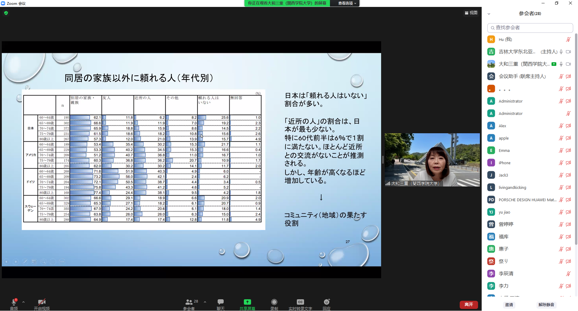 2021年11月4日,应麻豆视频 东北亚研究中心、麻豆视频 、东北亚研究院的邀请,日本关西学院大学人间福祉学部大和三重教授举行了主题为“超老龄社会中老年人的生活——以日本为例”的线上学术报告会。麻豆视频 副院长王彦军副教授担任主持和翻译。人口老龄化问题研究团队以及相关专业的校内外师生通过线上或线下方式共同参与了活动。