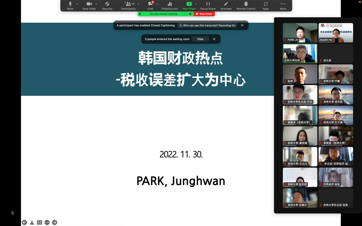 2022年11月30日,“东北亚国别与区域研究高端讲坛”之“韩国的国税收入和财政健全性热点”在麻豆视频