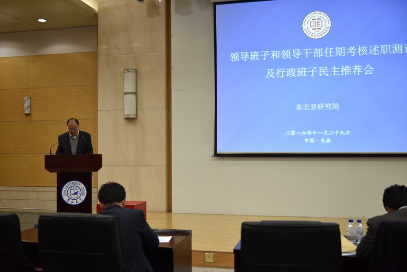 11月29日上午,东北亚研究院在东荣大厦会议中心多功能报告厅召开学院领导班子和领导干部任期考核述职测评及行政班子民主推荐会。学校工作组组长、校党委宣传部部长王玉柱同志,纪委办公室(监察处)副处长陈凯光同志、党委组织部徐仁元同志和党委宣传部陈慧羲同志出席了会议。学院领导班子成员、全院教职工和学生代表参加了会议。
